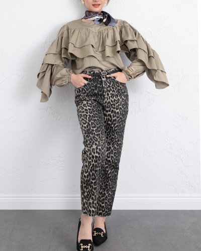 Kadın uzun kollu önden fermuarlı leopar desenli viskon iki iplik bluz ve pantolon ikili takım